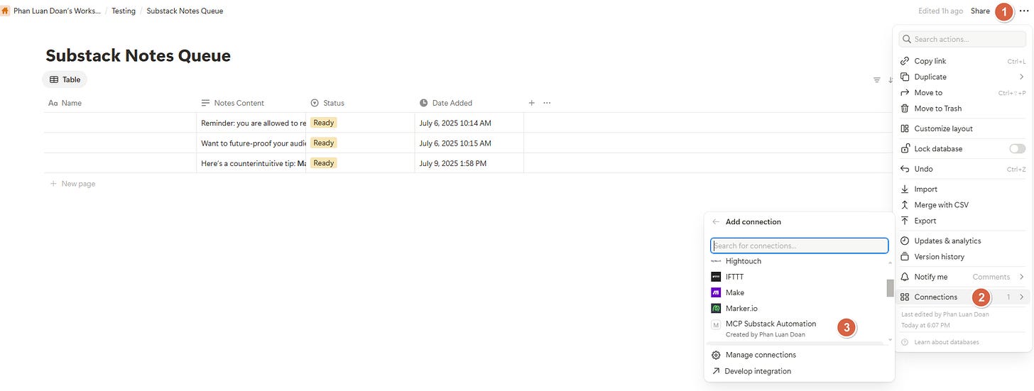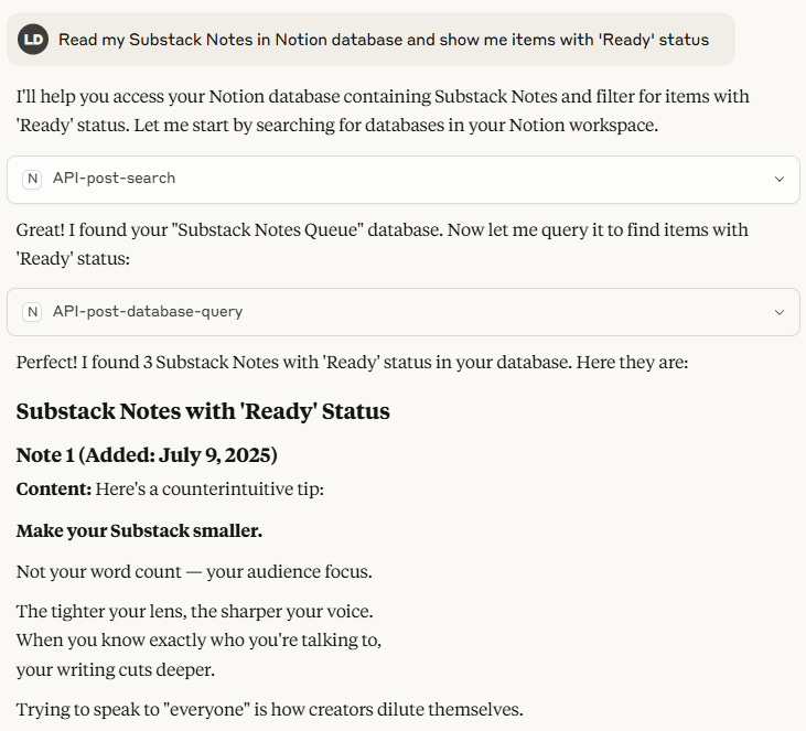 - "Read my Substack Notes from Notion database and show me items with 'Ready' status"